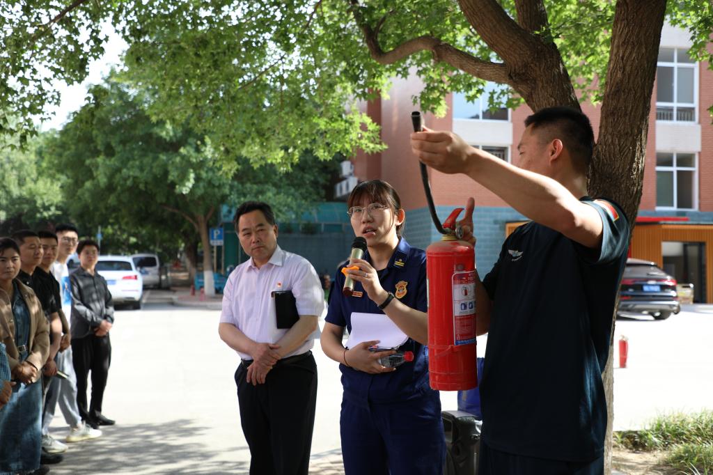 理论知识培训后,安全管理处对参会人员进行了安全基础知识笔试测试和灭火技能实地培训,在场的学校领导和教职员工在室外学习了灭火器的使用方法,并进行了实地灭火演练。