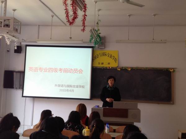 随着英语专业四级考试的临近,外国语与国际交流学院在张维娜院长的领导下举办了英语专业四级强化班、英语专业四级专题讲座及英语专业四级考前动员会。为了进一步鼓励激励同学们,外国语与国际交流学院张维娜院长、张艳芳教学副院长及英语第一教研室两位教研室副主任莅临指导英语专业四级考前动员会,并作出重要讲话。